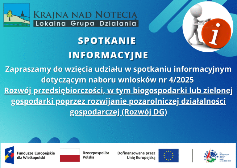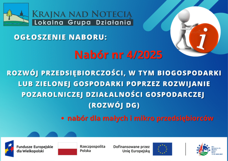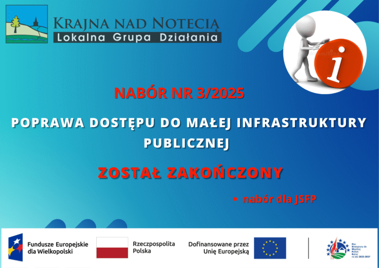 Informacja o zakończeniu naboru nr 3/2025 2025-10-06 Stowarzyszenie Lokalna Grupa Działania Krajna nad Notecią informuje, że zakończył się nabór nr 3/2025 w zakresie: „Poprawa dostępu do małej